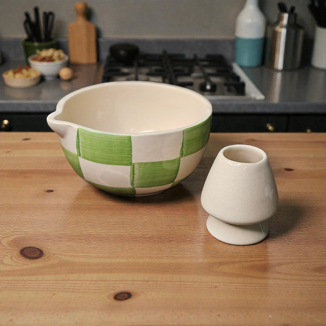 MATCHA BOWL WITH HOLDER – GREEN CHECK PRINT | 5 INCH CERAMIC ✅ Green Check...