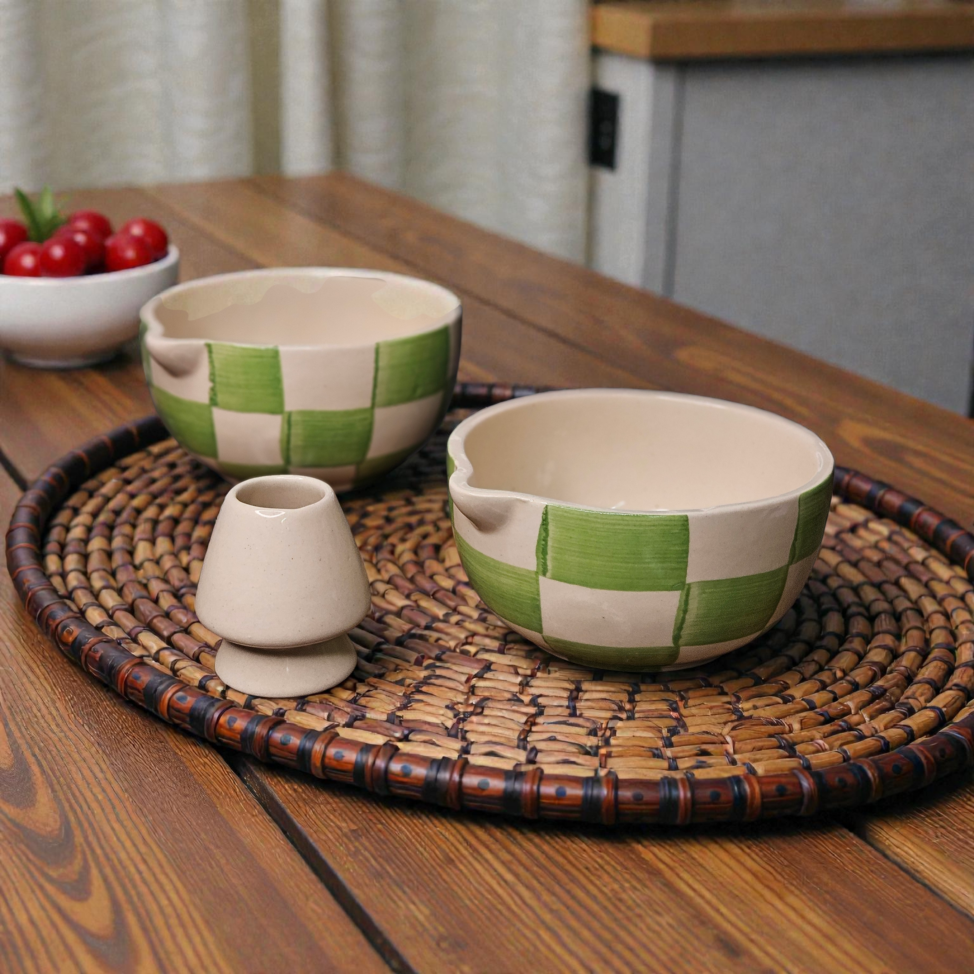 MATCHA BOWL WITH HOLDER – GREEN CHECK PRINT | 5 INCH CERAMIC